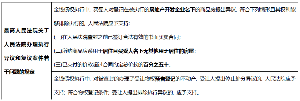 值得注意的是, 已辦理預(yù)告登記的受讓人同樣可以排除抵押權(quán)人的執(zhí)行, 并且無(wú)需符合上述條件。因此,建議金融機(jī)構(gòu)作為債權(quán)人在接受或行使在建工程抵押權(quán)時(shí), 對(duì)物權(quán)預(yù)告登記情況進(jìn)行核查, 以免權(quán)利落空或徒增執(zhí)行異議司法程序的不便。而受讓出險(xiǎn)房企的預(yù)售期房的相對(duì)安全模式顯然也是辦理預(yù)告登記。
