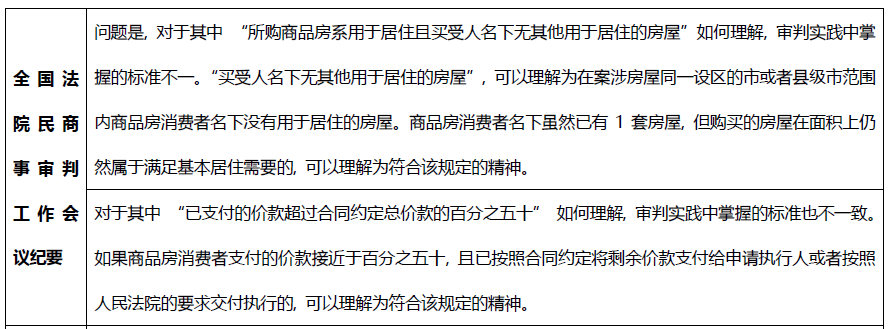 對(duì)于商品房消費(fèi)者而言, 只要在人民法院查封之前已簽訂合法有效的書面買賣合同, 并且已支付超過或接近百分之五十的價(jià)款, 即可排除他人執(zhí)行, 這個(gè)他人包括了其他查封了該房屋的債權(quán)人, 在該房屋上設(shè)定抵押的抵押權(quán)人以及建設(shè)該房屋的承包人。但只有在案涉房屋同一設(shè)區(qū)的市或者縣級(jí)市范圍內(nèi)名下(包括配偶和未成年子女明顯)沒有用于居住的房屋或雖有1套房屋,但購(gòu)買的房屋在面積上仍然屬于滿足基本居住需要的, 才屬于消費(fèi)者, 方可享有該等“超級(jí)優(yōu)先權(quán)”。值得注意的是, 司法實(shí)踐中, 法院判斷是否為“合法有效的書面買賣合同”時(shí)并不要求以“網(wǎng)簽備案”為前提, 也不以該等房屋是否已取得預(yù)售許可證為前提。以恒大較多無(wú)法辦理網(wǎng)簽的項(xiàng)目或某些房企未取得預(yù)售許可證的違規(guī)銷售為例, 將大大增加了金融債權(quán)人核查抵押物潛在已售出、無(wú)法行使抵押權(quán)風(fēng)險(xiǎn)的難度。