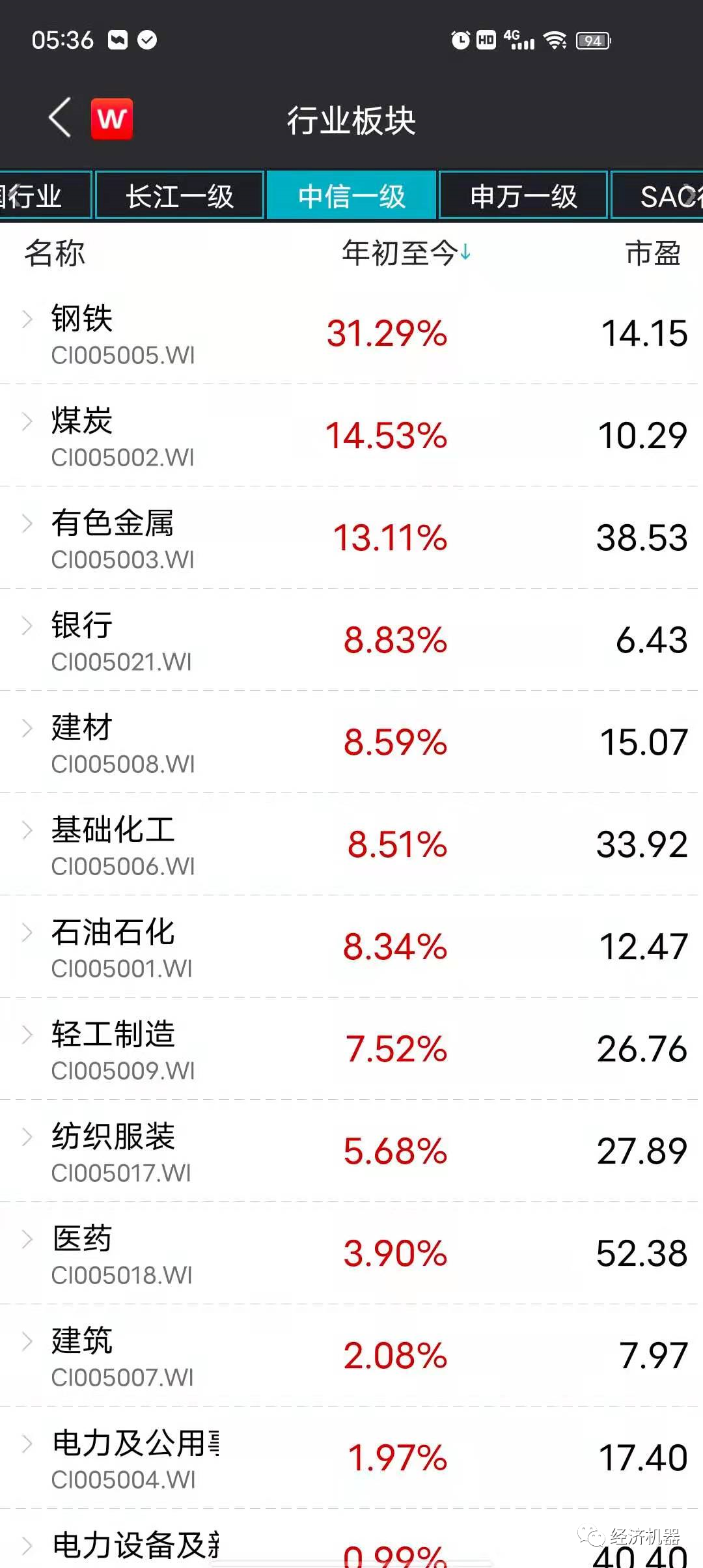 從年初至今的表現看,方向基本符合預期。如果說,有什么超預期的,那就是,大宗商品暴漲和周期暴動,比預期來的更猛烈、更堅決。股市方面,30個中信一級行業中,周期和金融在漲幅前十中占據了8個,鋼鐵、煤炭、有色金屬等大宗商品相關行業漲幅位居前三,遠跑贏其他行業(圖1)。
