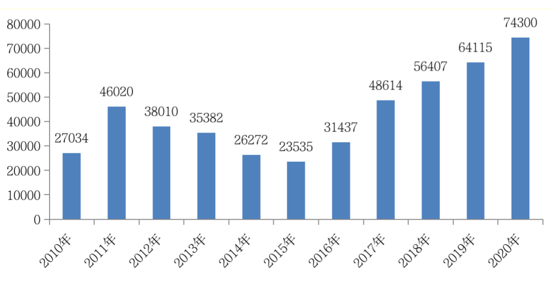 與土地成交規(guī)模變動(dòng)走勢(shì)一致,成交金額較去年同期也有明顯上漲:2020年全國土地成交金額累計(jì)已達(dá)74300億元,同比去年增長了16%。