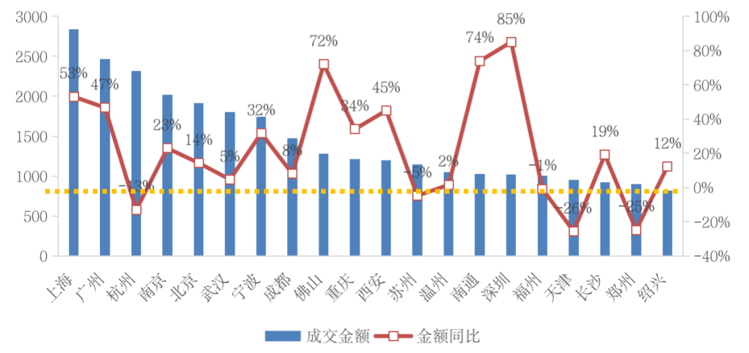 三四線城市有佛山、溫州、南通、紹興四城入榜,數(shù)量較2019年增加1個(gè);就具體的成交金額來看,四個(gè)城市的成交金額均超過了2019年,其中佛山、南通的成交金額的漲幅均在70%以上,尤其是滬蘇通高鐵開通利好之下的南通,成交金額增至1028億元,同比漲幅高達(dá)74%,漲幅在金額榜TOP20城市中僅次于深圳。