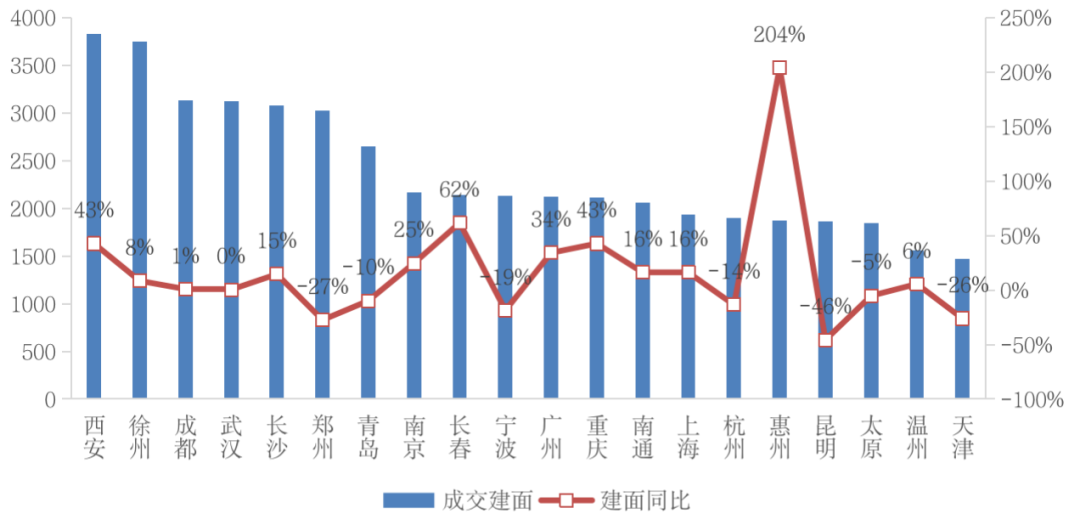 2020年,西安以3830萬平方米成交建面躍居榜首,與去年同期相比,成交建面同比增幅達(dá)43%;其次是徐州,成交體量達(dá)3746萬平方米,同比上漲8%;排在第三位的是成都,成交量達(dá)3131萬平方米,同比漲幅1%。