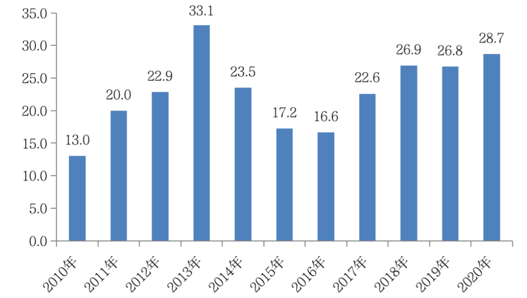 分季度來看,2020年溢價(jià)率經(jīng)歷了“先升后降”之勢(shì):在優(yōu)質(zhì)地塊大量成交、各城市降低房企拿地門檻的影響下,溢價(jià)率在2020年二季度升至高位,而受三季度后期 “三道紅線”政策出臺(tái),房企融資渠道明顯收緊,溢價(jià)率轉(zhuǎn)而走低,四季度也基本延續(xù)了三季度的下降之勢(shì),溢價(jià)率降至12.0%。