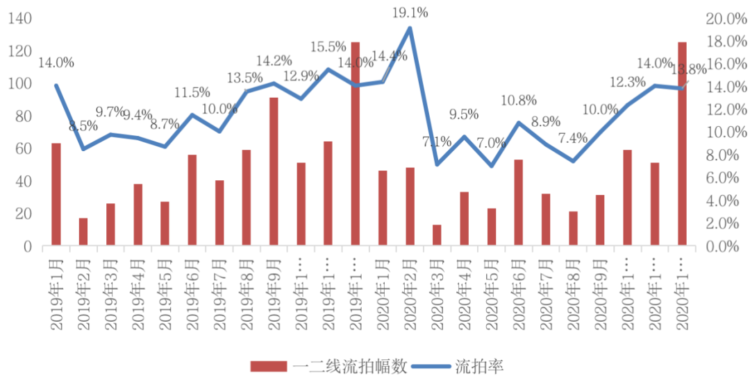 圖:2019年-2020年重點(diǎn)監(jiān)測(cè)城市流拍率及一二線土地流拍幅數(shù)(單位:%,幅)