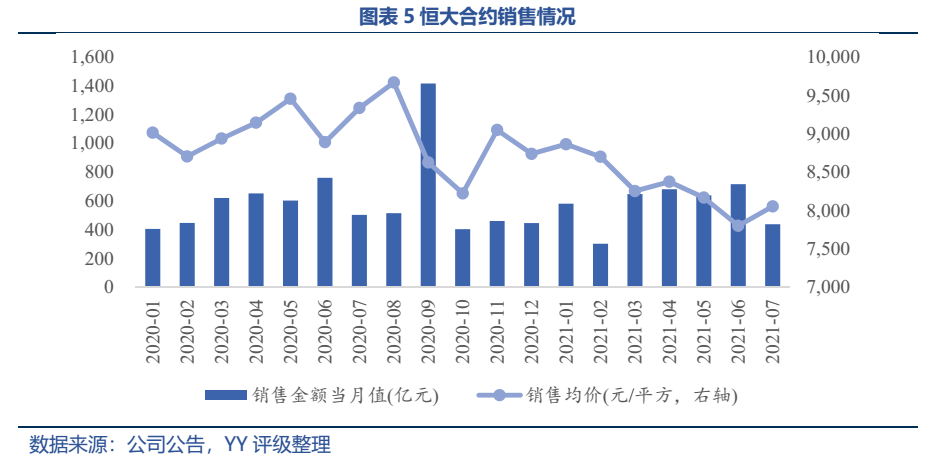 在大面積打折促銷下,恒大今年上半年交樓均價下跌11.2%,20年8月恒大的合約銷售均價曾一度達9,669.42元/平,近一年內呈坡式下滑,21年7月一路跌至8,055.2元/平。