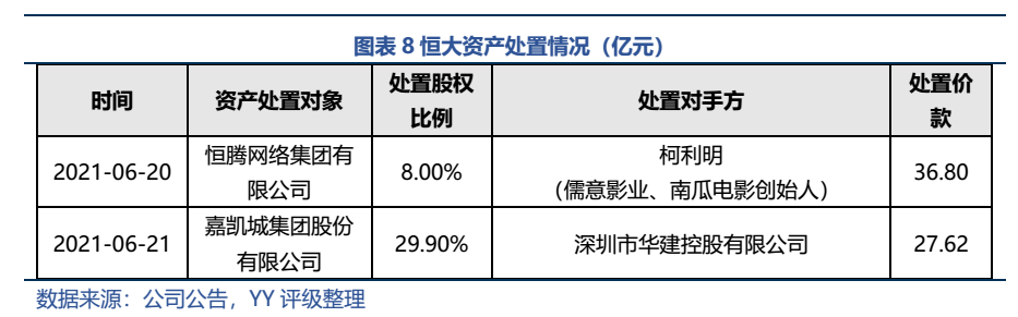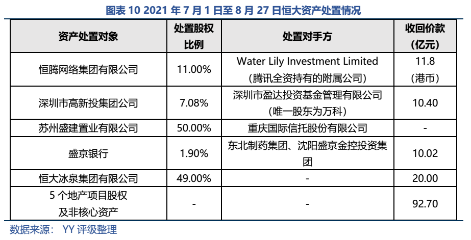 回籠資金仍然是當務之急,7月至8月間,恒大多次出讓股權,累計回籠近143億元。據傳,后續恒大旅游集團將與地產合并,健康項目劃至汽車,集團規模戰略調整。集團正積極處置非核心資產,甚至可能出售物業板塊、恒大汽車和香港的總部大樓。