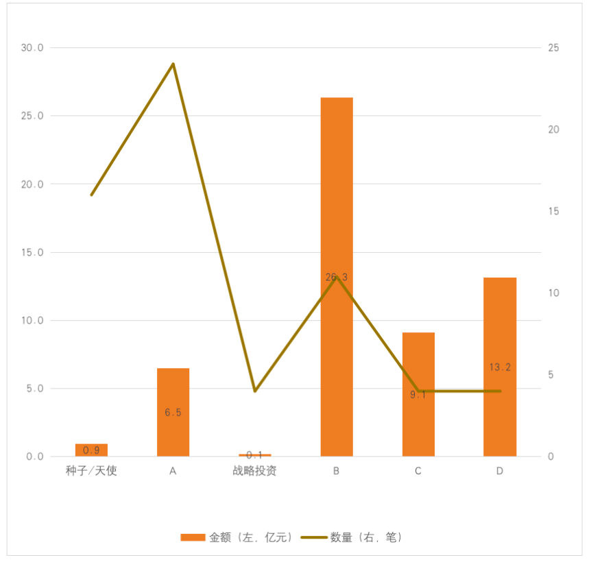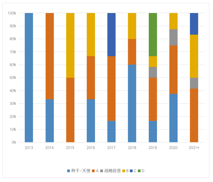 注:A輪包含Pre-A、A、A+,其他同理,戰(zhàn)略投資均發(fā)生在種子/天使輪或Pre-A輪后;下同。