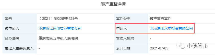 7月5日,重慶市第五中級人民法院發布案號為(2021)渝05破申428號的破產審查公告,重慶市協信遠創實業有限公司(以下簡稱“協信遠創”)被申請破產重整,申請人為北京易禾水星投資有限公司。