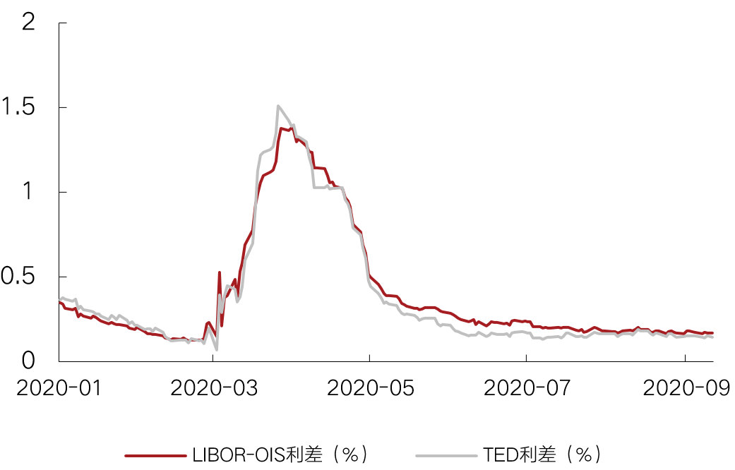 注:LIBOR-OIS利差(3個月倫敦銀行間市場利率LIBOR減去隔夜指數互換利率OIS)與TED利差(3個月倫敦銀行間市場利率LIBOR減去3個月美國國債利率)是市場常用的兩個指標。
