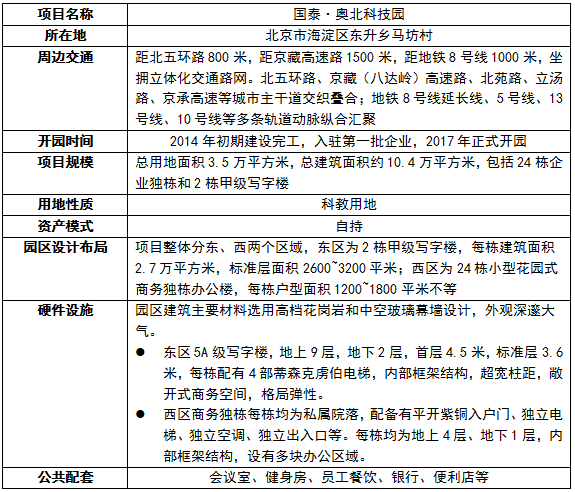 國泰奧北科技園總用地面積3.5萬平方米,總建筑面積10.4萬平方米。2014年園區初期建設完工后,入駐第一批企業,2017年正式開園。項目整體分為東、西兩個區域,東區為2棟甲級寫字樓,西區為24棟小型花園式商務獨棟辦公樓。