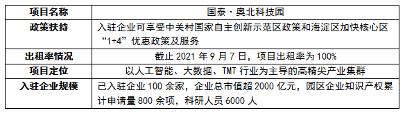 國泰奧北科技園定位為服務于人工智能、大數據、TMT行業為主導的產業園區,現已入駐100多家高新科技企業。入駐企業可享受中關村國家自主創新示范區政策和海淀區加快核心區“1+4”優惠政策及服務。已入駐企業包括比特大陸、索為系統、山石網科、集創北方、中鋼設備、航天長屏等獨角獸企業,16家上市及準上市公司。2018年園區內企業總市值就已超過2000億元,企業總產值超過300億元,納稅額超過30億元。