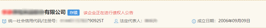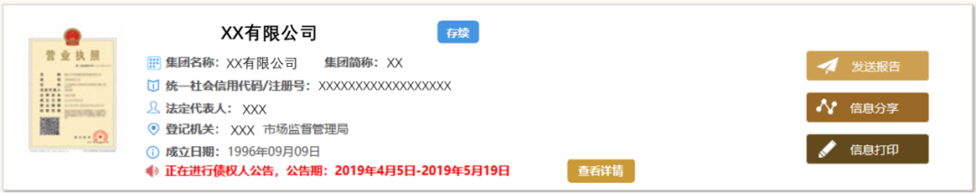 5.2在企業信息頁面,標注“正在進行債權人公告,公告期:XX年X 月X日- XX年X 月X日”