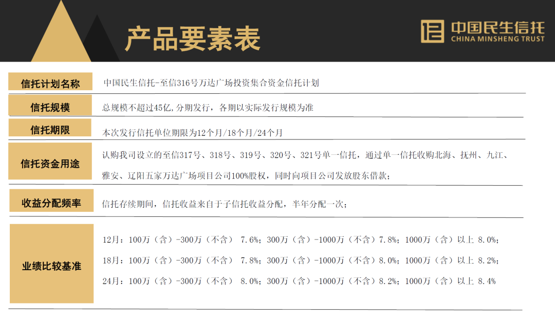 來自該信托計劃(民生至信317/318/319/320/321)投資人提供的關于該信托計劃的產品要素表。說明了一切。