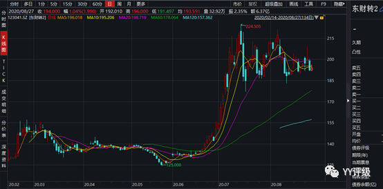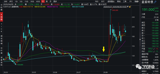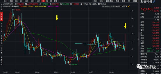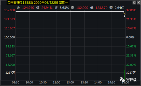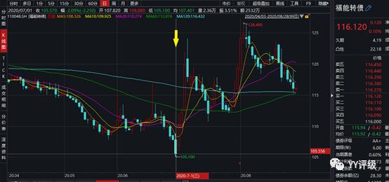 案例2:益豐轉(zhuǎn)債2020年6月22日上市,當天開盤的轉(zhuǎn)股價值在117左右,作為藥房龍頭,在轉(zhuǎn)債市場具有稀缺性,上市當天集合競價直接成交在130,觸發(fā)上交所臨停機制,到當天14:57分恢復交易。一級投資者的出貨需求在最后3分鐘才得到釋放,價格被砸到125,對應收盤時的轉(zhuǎn)股價值117,溢價率不足10%,是很好的買入時點。