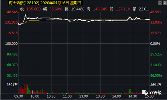 案例1:海大轉(zhuǎn)債2020年4月16日上市,按正股開盤價計算轉(zhuǎn)股價值為119.72,但轉(zhuǎn)債開盤后價格一度砸到將近127,量還不小。海大集團當時的正股走勢很強,基本面也很好,這樣的優(yōu)質(zhì)標的,價格130以下,轉(zhuǎn)股溢價率10%以下,是一級投資者出貨才砸出來的機會。