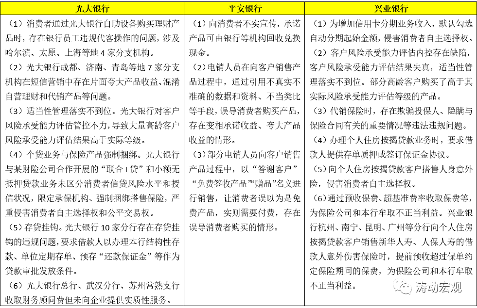 (4)2021年7月7日,銀保監會消費者保護局通報興業銀行存在默認勾選信用卡自動分期起始金額、適當性管理落實不到位、向個人住房按揭貸款客戶搭售人身意外險以及代銷保險業務中欺騙投保人、隱瞞與保險合同有關的重要情況等6類違法違規問題。