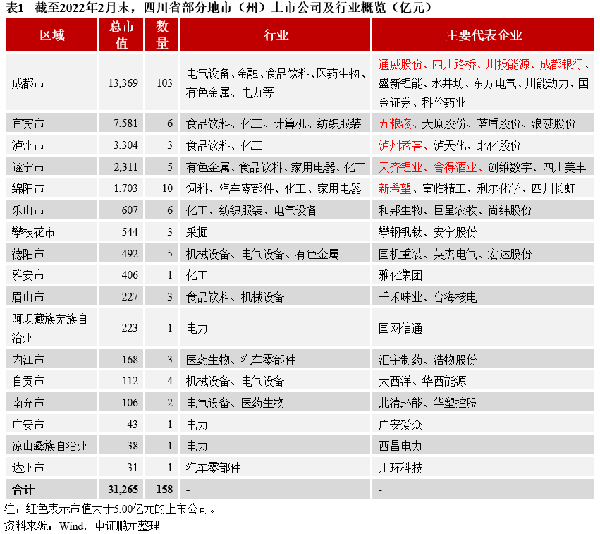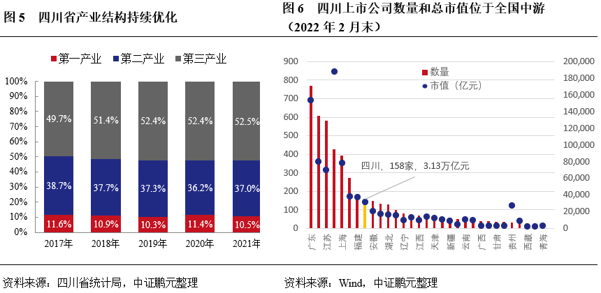 四川省產業結構不斷優化,工業基礎尚可,以傳統資源型、重化工產業等為主。近年來四川省產業結構不斷優化,第三產業占比持續提升,三產結構由2017年的11.6:38.7:49.7變為2021年的10.5:37.0:52.5。第二產業占比略有下降,但近年四川省工業實力不斷增強,仍對區域經濟形成較好支撐。得益于自然資源優勢、“西部大開發”戰略和承接東部制造業轉移等,四川省培育和引進了鴻富錦、五糧液、四川長虹、攀鋼、戴爾、英特爾等重點工業企業,對區域工業發展形成較強引領帶動作用。目前四川省工業仍以傳統資源型、重化工產業等為主,根據《四川省國民經濟和社會發展第十四個五年規劃和二〇三五年遠景目標綱要》,未來將聚焦“5+1”現代工業體系,即五大現代產業(電子信息、裝備制造、食品飲料、先進材料、能源化工)和數字經濟產業。2020年全省五大現代產業營業收入達4.3萬億元,其中電子信息產業營收1.3萬億元;2021年五大現代產業增加值比上年增長10.9%,兩年平均增長8.0%,占規上工業比重為82.8%。2021年,四川規上工業增加值比上年增長9.8%,列全國第13位,兩年平均增長7.1%。截至2022年2月末,四川省A股上市公司有158家,總市值3.13萬億元,位于全國中游水平。