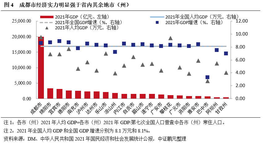 四川省各市(州)經濟發展不均衡,省會成都市的極核與主干功能突出。省會成都是全省的經濟、金融中心和交通通信樞紐,2020年末全市常住人口突破2,000萬,占全省人口的比例約1/4;成都市經濟實力明顯強于其余地市(州),2021年全市GDP規模近2萬億元,占全省GDP總量的比例為36.99%,其余市(州)GDP均在3,500億元以下,其中資陽、雅安、巴中、阿壩州和甘孜州的GDP未突破千億元;成都市經濟增速為8.6%,高于全國及四川省平均水平;成都市上市公司數量占全省比例為65.19%。