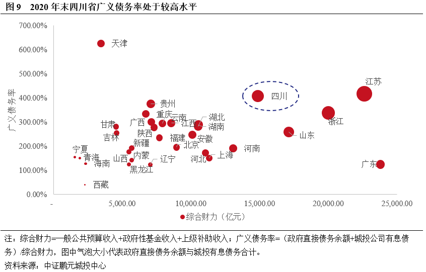 四川廣義債務規模和債務率均處于全國較高水平,債務負擔偏重。截至2020年末,四川省地方政府債務余額為1.27萬億元,城投有息債務余額為4.80萬億元,廣義債務規模(政府直接債務+城投有息債務)達6.07萬億元;廣義債務率[(政府債務余額+城投有息債務)/(一般公共預算收入+政府性基金收入+上級補助收入)]為408%,廣義債務規模和債務率均居全國第三,處于較高水平。