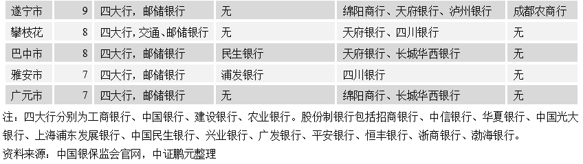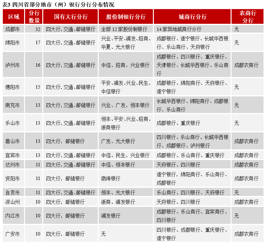 區域金融資源方面,對于國有大行、股份制銀行和異地城農商行在當地設有分行的城市,區域城投平臺獲取信貸和投債額度具有便利性。四川省金融資源主要集中在成都市,成都市擁有6家國有大行分行和全部12家股份制銀行,分行數量合計達32家;其余分行數量前三的城市為綿陽、瀘州和德陽,數量分別為17家、16家和15家,綿陽市的股份制銀行和異地城商行分行數量均居首位;攀枝花、遂寧、巴中等5個地級市的銀行分行數量不足10家。