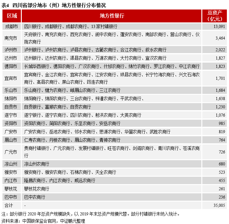 地方性銀行一般集中在本地展業,與地方政府關系密切,對當地城投平臺提供融資支持的積極性相對較高,有利于特殊情況下地方政府協調金融資源。成都市地方性銀行數量和規模均居首位,總資產達13,091億元;其余地市(州)中,南充市地方性銀行數量較多,總資產規模3,464億元;瀘州、達州、德陽、宜賓、樂山、綿陽的地方性銀行總資產在1,500億元-2,000億元左右,有9個地市(州)總資產在千億元以下,整體規模較小。