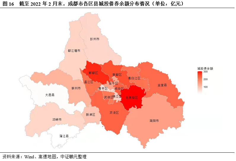 成都市內龍泉驛、簡陽市、金堂縣廣義債務率較高,債務負擔較重。從成都市內各區域債務分布來看,廣義債務規模前四大區域為龍泉驛、天府新區、高新區和雙流區,規模分別為1,423.95億元、948.51億元、731.22億元和714.69億元;其次是金堂縣、青白江區、溫江區、新都區和簡陽市,廣義債務規模在600-700億元之間。從廣義債務率來看,龍泉驛、簡陽市、金堂縣廣義債務率均較高,分別為763%、605%和570%,債務負擔較重;其次為郫都區、成華區、金牛區和青白江區,廣義債務率在500-550%之間;高新區、天府新區和雙流區雖然廣義債務規模大,但區域綜合財力較強,廣義債務率水平相對較低。