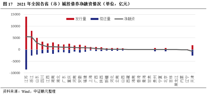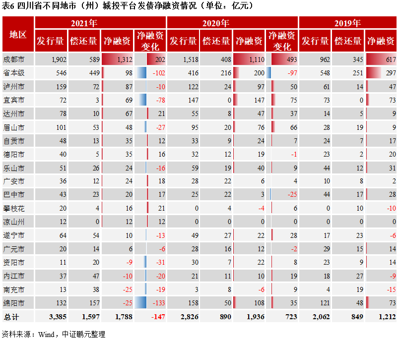 近三年四川省大部分地市(州)城投債融資保持凈流入,成都市凈融資額保持增長,但2021年省級和近一半地市(州)城投債凈融資額同比下降。2019-2021年四川省大部分地市(州)城投債保持凈流入,債券發行與償還量集中在省級和成都市城投平臺,2021年成都市城投債凈融資1,312億元,同比增加202億元;省級城投債凈融資98億元,同比減少102億元;2021年四川省共有10個地市(州)的城投債凈融資額同比下降,其中宜賓和綿陽城投債凈融資下降較多,分別同比下降78億元和133億元。