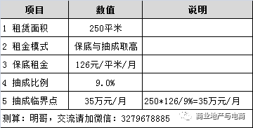 該商戶保底租金126元/月/平米,抽成比例9%,則抽成臨界點(diǎn)為:
