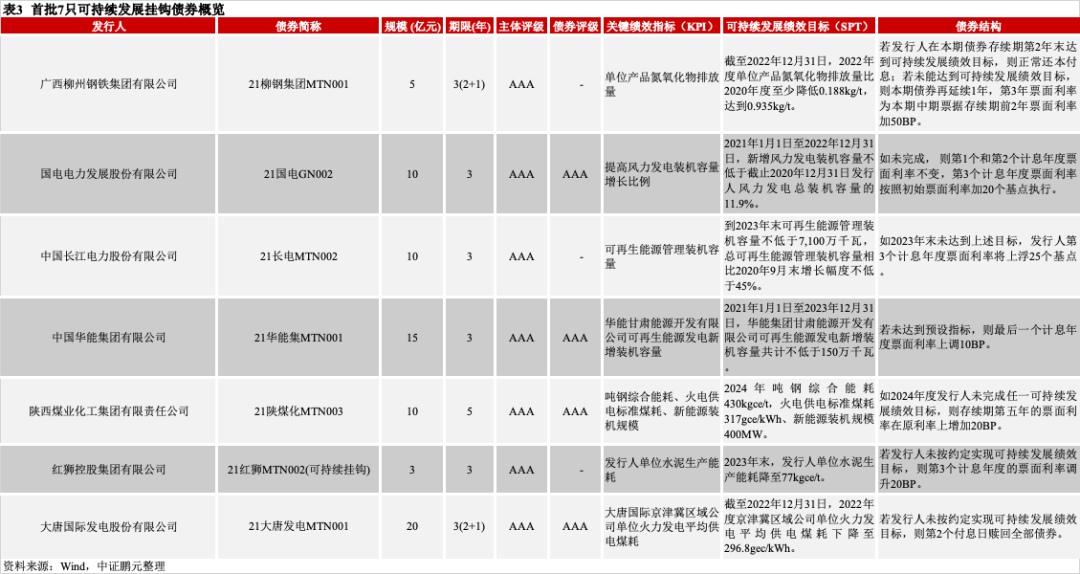 銀行間債券市場首批有7家企業發行了可持續發展掛鉤債券,募集資金規模73億元,具體情況見表3。從發行人來看,有電力、鋼鐵、煤化工、水泥生產企業;發行人主體信用級別均為AAA級;可持續發展掛鉤債券的發行期限以3年為主;掛鉤的關鍵績效指標有新能源發電裝機容量、單位產品能耗和污染物排放量,掛鉤的債券結構設計有續期、利率調升、贖回。