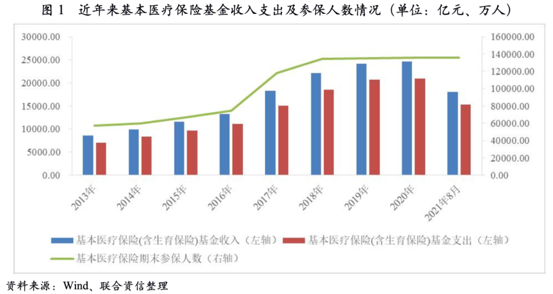 從醫(yī)藥行業(yè)下游支付能力來看,醫(yī)保基金作為最重要的支付方,其支付額約占整體醫(yī)療衛(wèi)生總費用的約40%,醫(yī)保基金的支付能力直接決定了醫(yī)藥行業(yè)的回款情況。根據(jù)國家醫(yī)保局數(shù)據(jù)顯示,2020年,全國基本醫(yī)保基金(含生育保險)總收入為2.46萬億元,同比增長0.08%;全國基本醫(yī)保基金(含生育保險)總支出為2.09萬億元,同比變化不大,年末醫(yī)保基金累計結(jié)余3.14萬億元。2021年1-10月,全國基本醫(yī)保基金(含生育保險)總收入為2.46萬億元,全國基本醫(yī)保基金(含生育保險)總支出為1.90萬億元。
