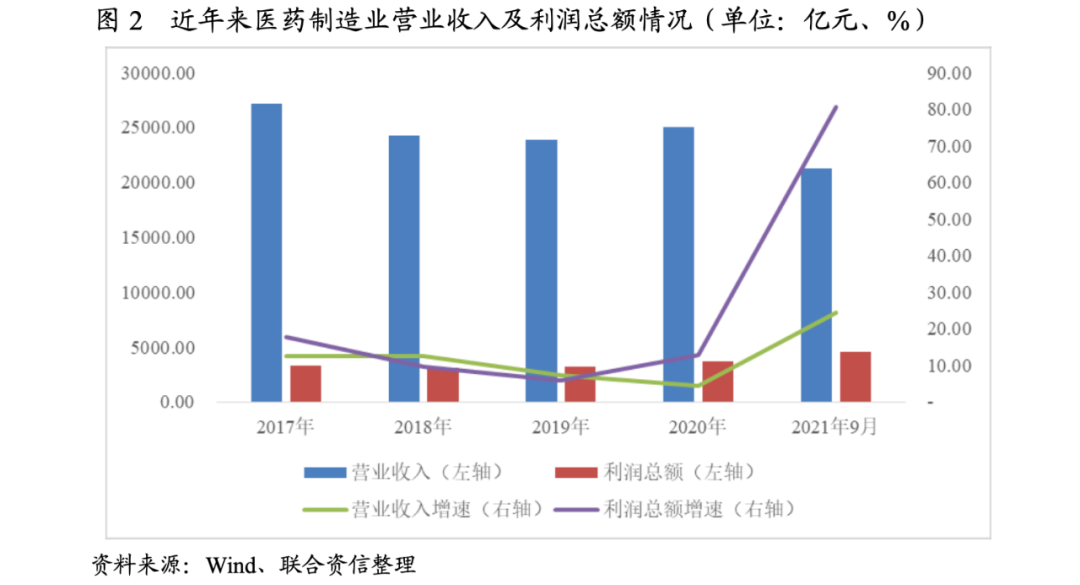 2020年,受新冠肺炎疫情影響,各層級醫(yī)療機構(gòu)日常診療活動減少,藥品終端銷售市場規(guī)模近年來首次出現(xiàn)負增長,但隨著人均可支配收入增長、人口老齡化趨勢逐年加重以及醫(yī)保收入和參保人數(shù)增加,中國醫(yī)藥需求仍保持穩(wěn)健。2021年以來,醫(yī)藥行業(yè)盈利水平逐漸從新冠肺炎疫情的影響中恢復,醫(yī)藥制造業(yè)企業(yè)營業(yè)收入和利潤總額均大幅增長;同時持續(xù)加強創(chuàng)新研發(fā)投入,行業(yè)內(nèi)企業(yè)獲現(xiàn)能力持續(xù)提升,杠桿水平處于合理水平。