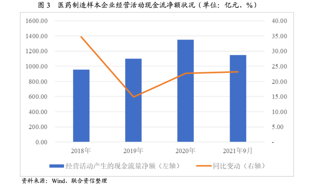 獲現(xiàn)能力方面,2021年1-9月,醫(yī)藥制造樣本企業(yè)經(jīng)營活動產(chǎn)生的現(xiàn)金流量凈額為1149.54億元,較上年同期增長23.20%,延續(xù)了2018年以來現(xiàn)金流持續(xù)優(yōu)化的行業(yè)發(fā)展趨勢。