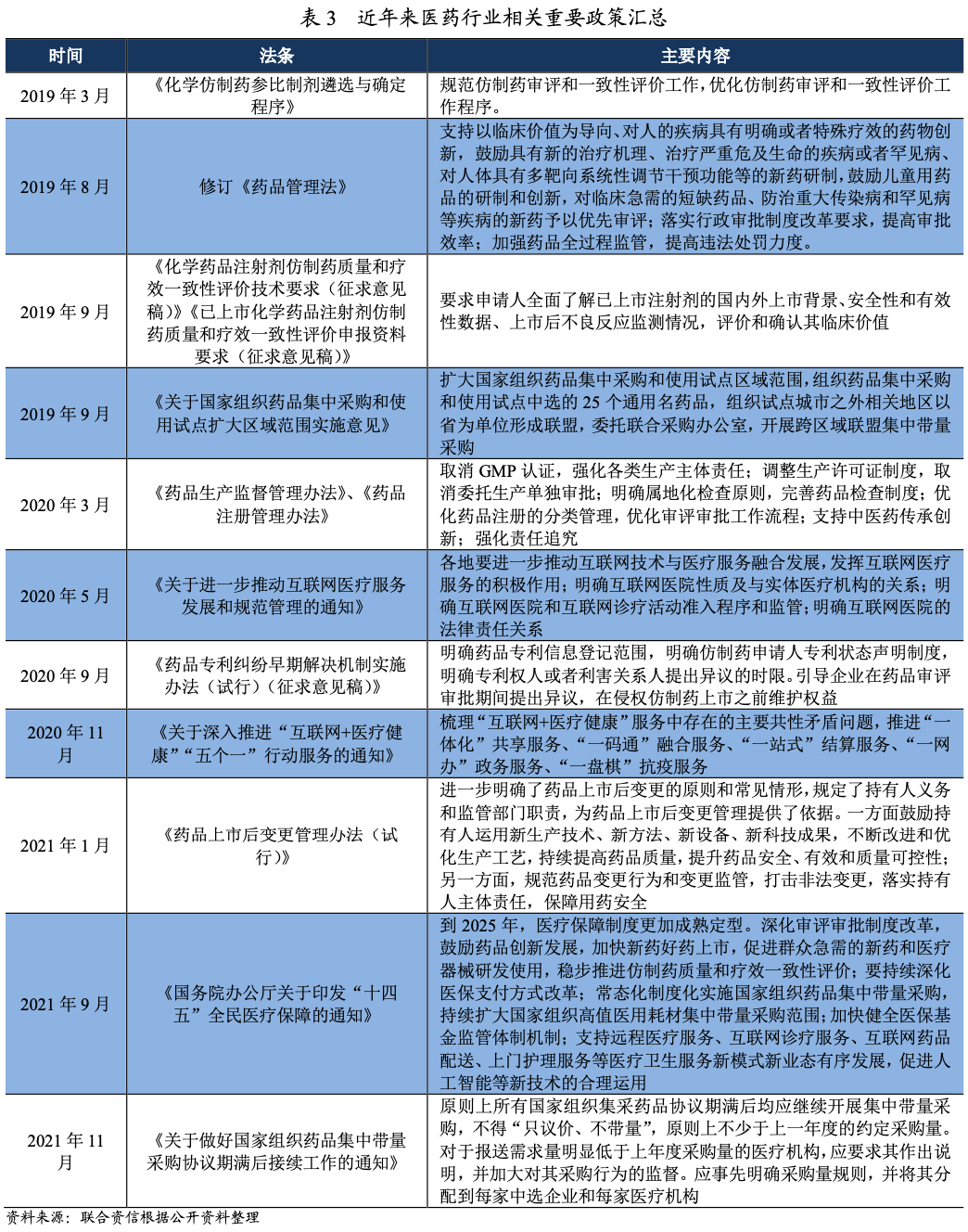 2019年以來,集中帶量采購、醫(yī)保控費等政策的持續(xù)推進為醫(yī)藥行業(yè)帶來了深刻變革;與此同時,藥品審評審批、專利糾紛早期解決等政策的不斷完善也為醫(yī)藥行業(yè)帶來了新的機遇。2020年新冠疫情催生“互聯(lián)網(wǎng)+醫(yī)療”的蓬勃發(fā)展,相關(guān)規(guī)范化政策的陸續(xù)出臺為“互聯(lián)網(wǎng)+醫(yī)療”的可持續(xù)發(fā)展保駕護航。2021年“十四五”規(guī)劃發(fā)布,進一步明確醫(yī)藥行業(yè)發(fā)展方向,各項政策持續(xù)推進。