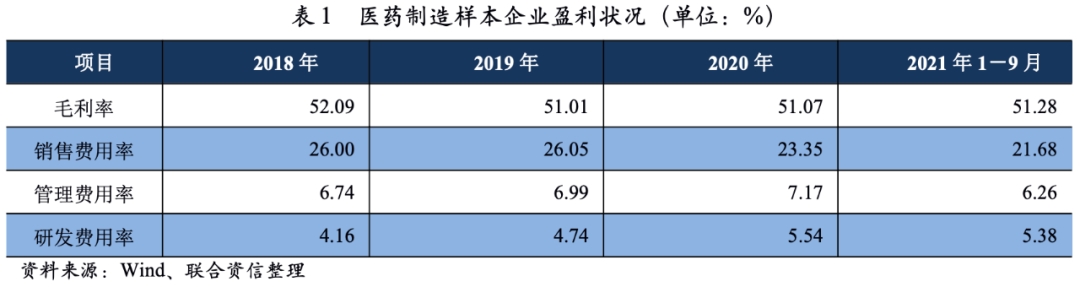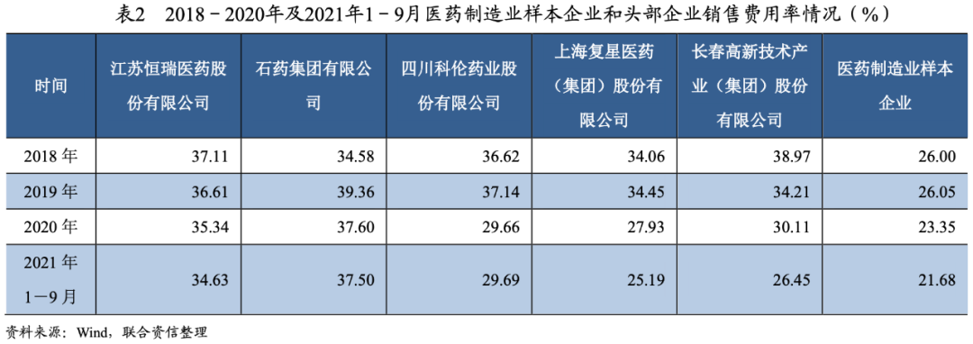 從醫(yī)藥制造業(yè)樣本數(shù)據(jù)分析[2]來看,2018-2020年,醫(yī)藥制造樣本企業(yè)銷售費用率分別為26.00%、26.05%和23.35%,波動下降,但處于較高水平。2021年1-9月,醫(yī)藥制造樣本企業(yè)銷售費用率為21.68%,較上年同期下降1.40個百分點。2018-2020年,頭部企業(yè)銷售費用率均大于27.00%,處于較高水平,對利潤水平存在一定影響。