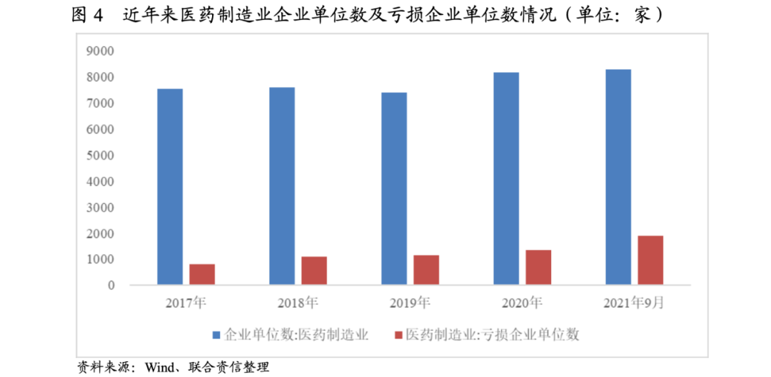 從行業(yè)主體數(shù)量來看,截至2020年底,醫(yī)藥制造業(yè)企業(yè)單位為8170家,較上年底增加778家;虧損企業(yè)1344家,較上年底增加193家。截至2021年9月底,醫(yī)藥制造業(yè)企業(yè)單位為8282家,較上年底增加112家;虧損企業(yè)1886家,較上年底增加542家。2020年以來,醫(yī)藥制造業(yè)企業(yè)數(shù)量增加較快,但虧損企業(yè)占比亦逐年上升,行業(yè)內(nèi)分化程度加深。