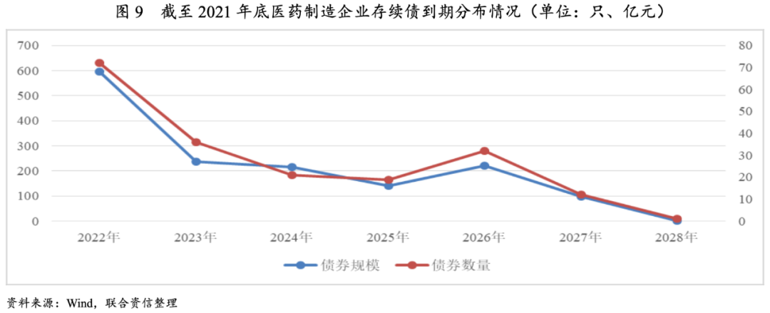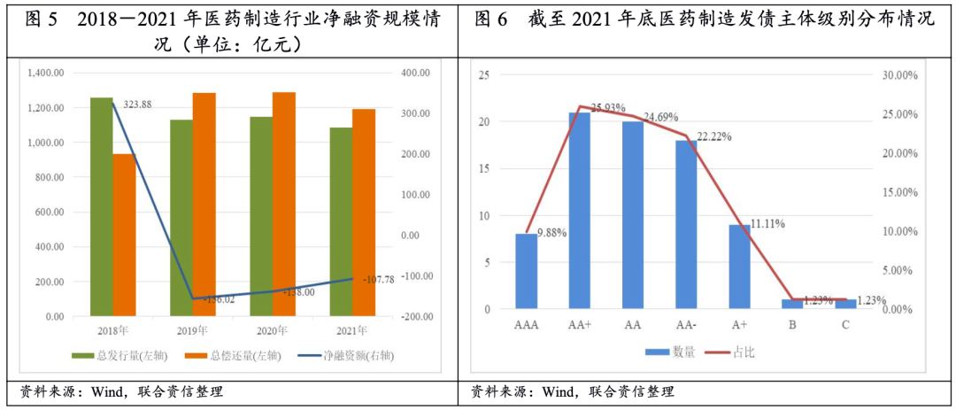 行業(yè)債務負擔加重,2021年醫(yī)藥制造行業(yè)債券到期規(guī)模較大,凈融資規(guī)模呈凈流出狀態(tài)。行業(yè)內(nèi)發(fā)債企業(yè)主要集中于AA+級別民營企業(yè)。
