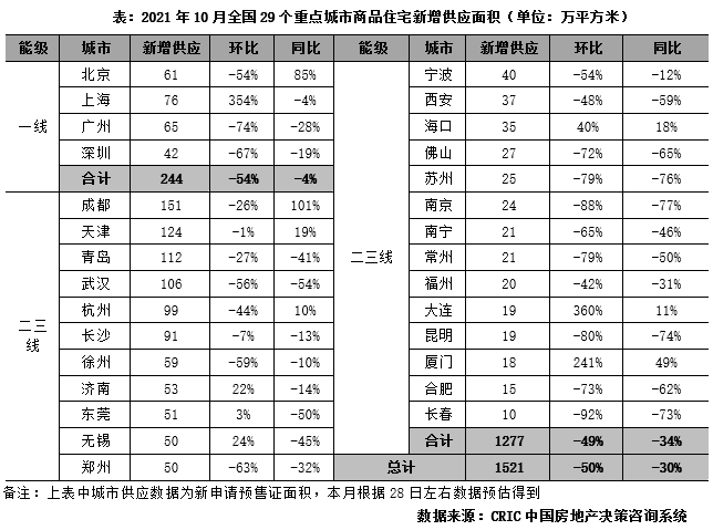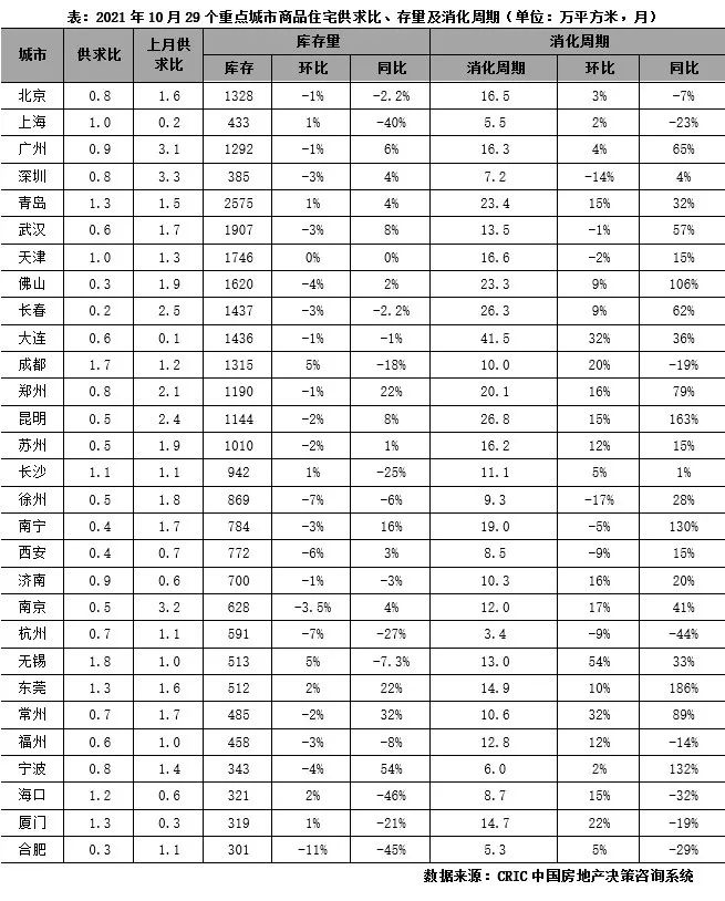 “金九”銷售節(jié)點過后,三四線城市新盤推貨量下滑下,10月熱點城市供應(yīng)環(huán)比下滑較成交更為顯著,故短期呈現(xiàn)供不應(yīng)求。29個重點城市整體供求比略低于0.8。
