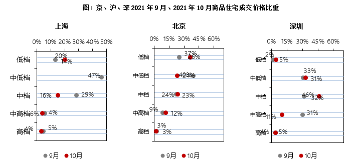 從價格段分布來看,低檔產(chǎn)品占比上海、北京和深圳分別上升7、11和3個百分點;中低檔產(chǎn)品占比上海和深圳分別上升9和2個百分點,北京下降16個百分點;中檔產(chǎn)品占比北京和深圳分別上升2和14個百分點,上海下降13個百分點;中高檔產(chǎn)品和高檔產(chǎn)品上海和深圳下降3和19個百分點,北京上升3個百分點。