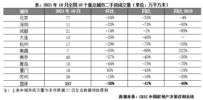 2021年10月,二手房市場整體延續(xù)下行走勢,規(guī)模上環(huán)比再降30%,10個重點城市共計成交257萬平方米。較去年同期相比規(guī)模收窄48%,同比2019年跌幅也高達40%,受困于全國樓市政策“嚴苛”,熱點城市調(diào)控力度有增無減,整體市場熱度降溫顯著。