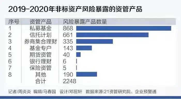 從21世紀資管研究院的數據顯示,2019-2020期間一共發生過的非標違約債項,僅從公開數據統計顯示就有超2200條之多。涉及信托計劃、券商集合、私募基金、期貨資管、銀行非保本理財和保險資管,波及的資管機構高達上百家。