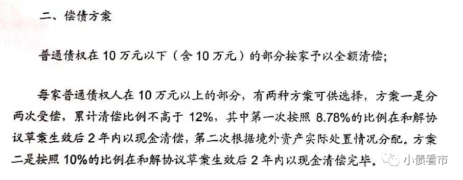 分兩次受償,累計清償比例不高于12%,其中第一次按8.78%比例在和解協議草案生效后兩年內現金清償,第二次根據境外資產實際處置情況分配。
