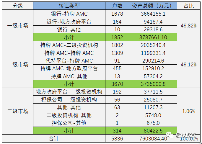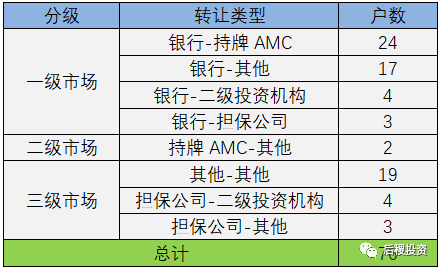 一般的,我們將銀行端出讓債權為一級市場,本地持牌AMC或代持機構出讓債權為二級市場,除此其他債權轉讓為三級市場。