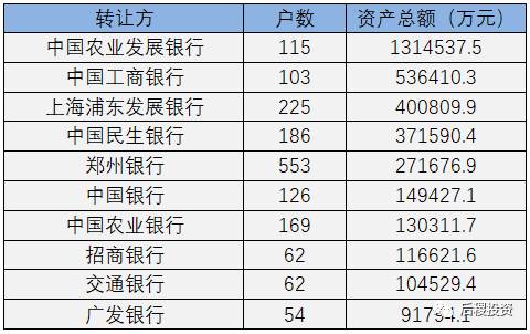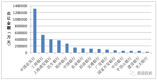 從上圖看,農發行出讓金額遙遙領先,其體量甚至超過工行、浦發行和民生銀行(2-4名)三家總和。五大國有銀行中(交行、中行、農行、建行、工行)僅工行一家位列前五。