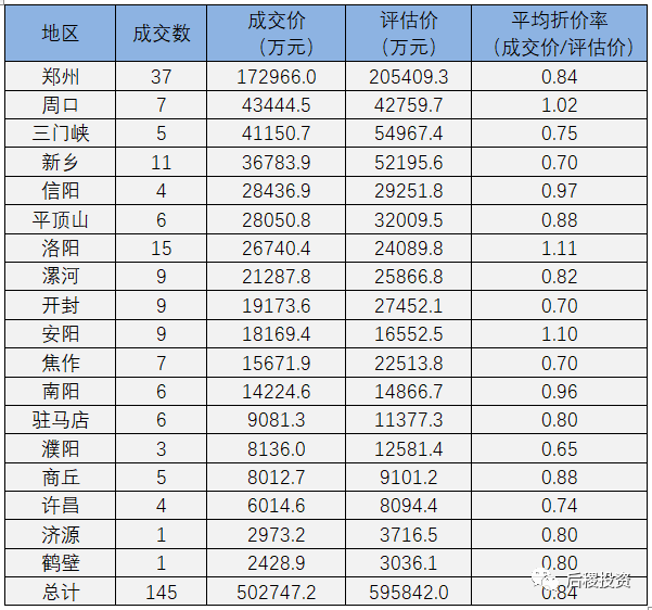 從淘寶法拍平臺中篩選出河南地區物權(超過1000萬)拍賣成交記錄,總成交數145,總成交價50.27億元,總評估價59.58億元,平均折價率為0.84。其中省會城市鄭州成交數和總成交價均最多,而平均折價率洛陽最高,達到1.11。