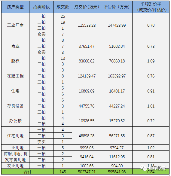 從上表可知,工業廠房成交量最多,農業用地成交量最少。成交量超過8個(含)的房產類型中,辦公樓的平均折價率最低,為0.72;股權的平均折價率最高,達到1.09。