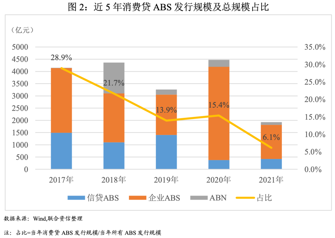4、消費貸ABS存續期表現穩定,信用質量依然出色。2021年,消費貸ABS存續期表現穩定,未出現評級下調或違約情況。由于消費ABS基礎資產分散度高,收益率較高,內部增信效果顯著,預計未來其信用質量依然出色。