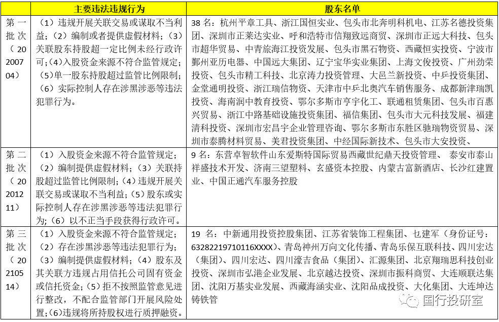 (2)2020年銀保監(jiān)會開展專項(xiàng)整治“回頭看”,覆蓋4600余家銀行保險(xiǎn)機(jī)構(gòu),不僅首次開展了覆蓋全部商業(yè)銀行和保險(xiǎn)公司的公司治理監(jiān)管評估以及銀行保險(xiǎn)機(jī)構(gòu)股權(quán)和關(guān)聯(lián)交易專項(xiàng)整治工作,還先后分三批次向社會公開了銀行保險(xiǎn)機(jī)構(gòu)重大違法違規(guī)股東(合計(jì)66家)。