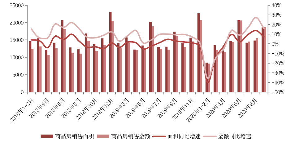 數據顯示,商品房銷售面積、金額同比增速出現回落,9月全國商品房銷售面積、金額同比增速分別較8月收窄了6.4個百分點和11.1個百分點,整體市場成交后勁不足。疊加8月底披露的房企融資“三條紅線”新規,新開工、土地購置均出現明顯放緩態勢。但房地產開發投資在建安投資強力支撐下(施工面積增速提升35個百分點)仍有較強韌性。
