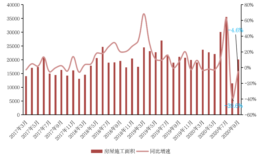 9月單月來看,全國房屋施工面積達20086萬平方米,與新開工面積單月同比增速由正轉負相反,施工面積9月同比降幅較8月收窄35個百分點至4.6%。房企加緊施工以加快項目上市銷售進度,從而盡早完成銷售回款是施工面積陡然增加的主要原因。