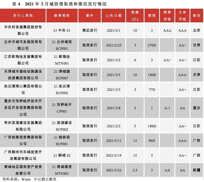 3月份共有10只城投債公告取消或推遲發(fā)行,涉及發(fā)行規(guī)模74.50億元,較2月份增幅較大。同期公告推遲發(fā)行的非城投信用債共有80只,涉及發(fā)行規(guī)模515.80億元。
